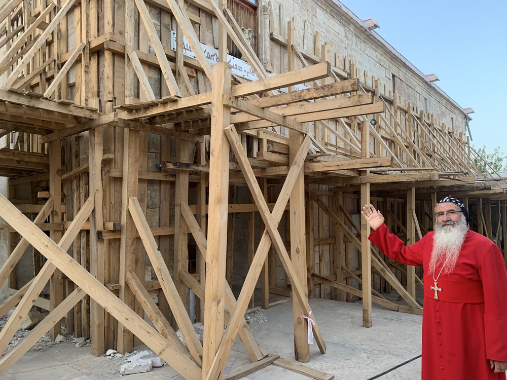 Erzbischof Grigorios vor seiner zerstörten Kirche in Adiyaman.